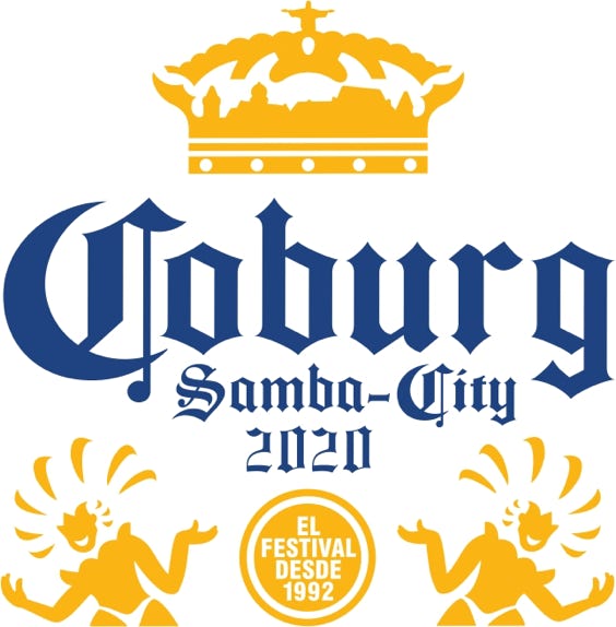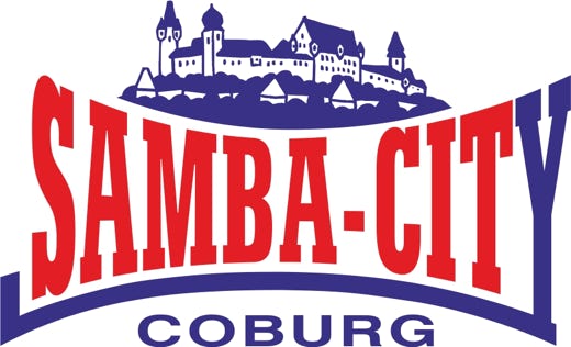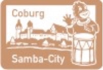 Das neue Coburger Autobahn-Hinweisschild in braun auf weiß mit dem trommelnden Schutzpatron Mauritius (das Motiv des ersten Festivals in 1991), der „Fränkischen Krone“ Veste Coburg im Hintergrund und dem Titel der Europäischen Samba-Haustadt: Coburg Samba-City.
